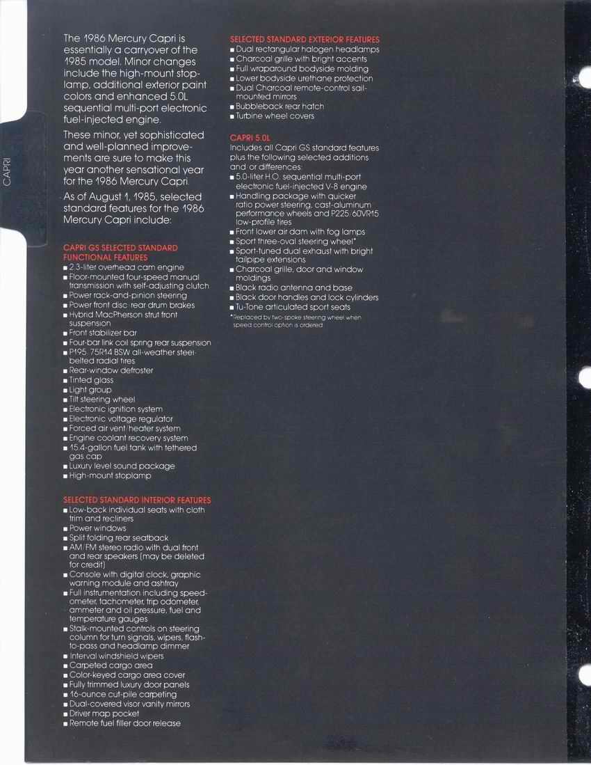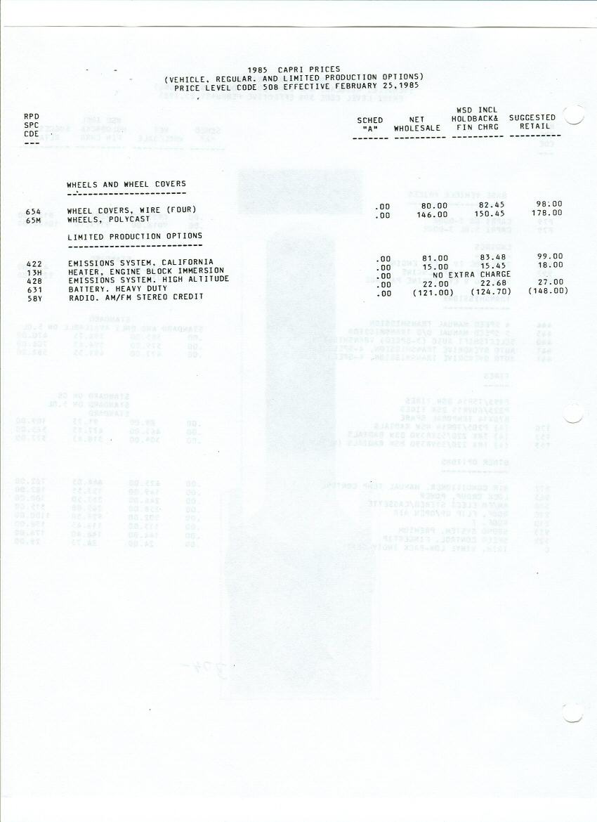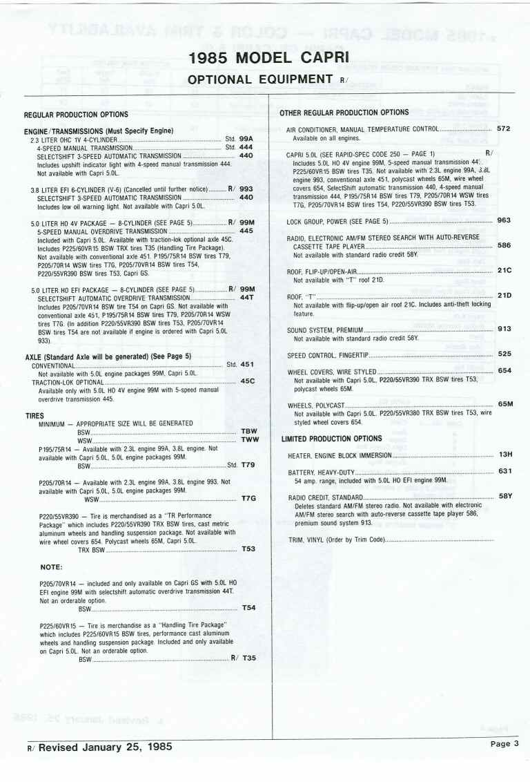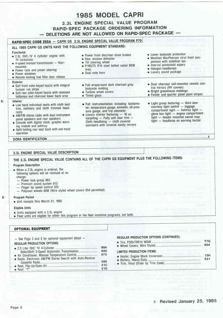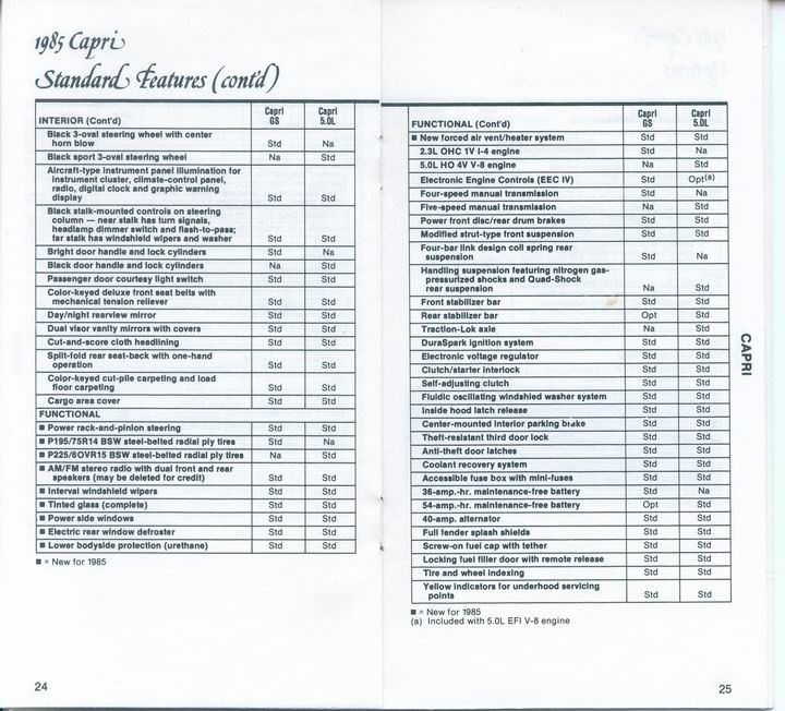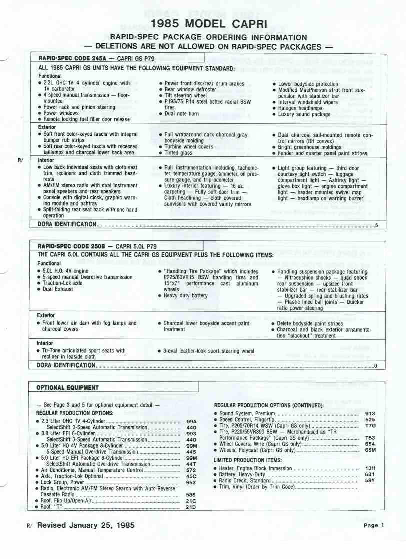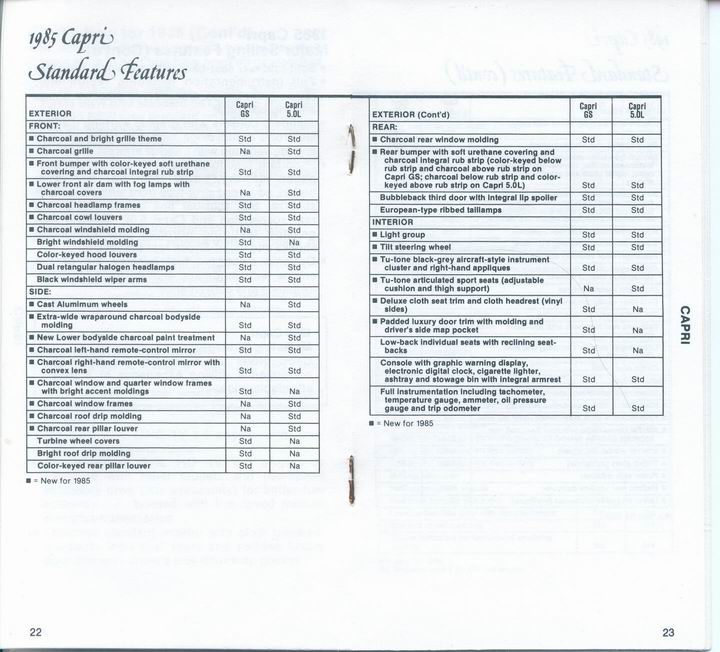 85 Capri standard features and options.