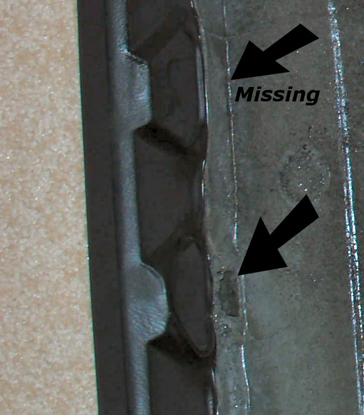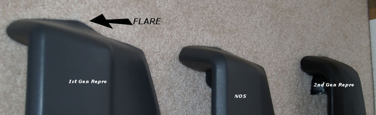 A very noticeable difference is the mounting tabs that are on the left and right of the gauge area. The NOS tab is a nice hard plastic tab. The 1stGen repro has flimsy tabs made from the rubber material of the pad. These tend to have cracks in them. The 2ndGen repro isn't any better than the previous generation. It's tabs are just extra vinyl material.