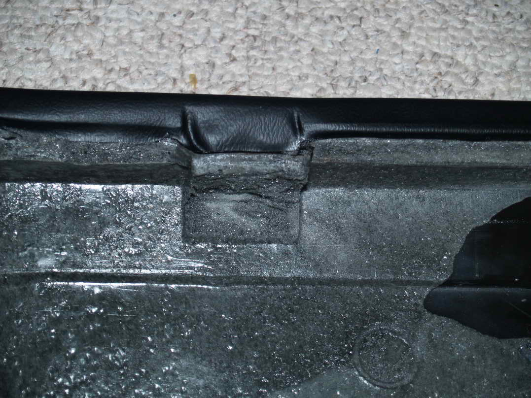 The NOS pad has an internal plastic frame surrounded by fairly rigid foam and a top layer of molded vinyl. It is this type of foam that makes this pad not feel all that flexible. I was hesitant to press to hard on it, knowing what that normally does to your everyday used pad. The surface is a bit flexible but nothing as good as the reproductions. The plastic frame can be seen from the underside of the pad. It extends throughout the whole pad and also includes the mounting points above the glove box and the sides and top of the gauge cluster.
