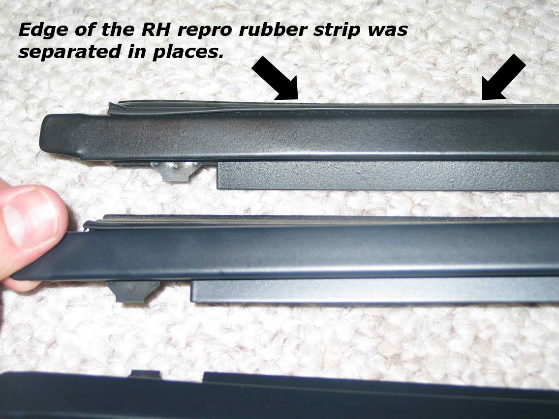 The repro's metal trim is thinner and feels "flimsier". As such I think it causes a couple of problems. The first is that the rubber fitment can potentially be loose It was fine on the LH but is not good on the RH repro I received. The NOS part is on the bottom.